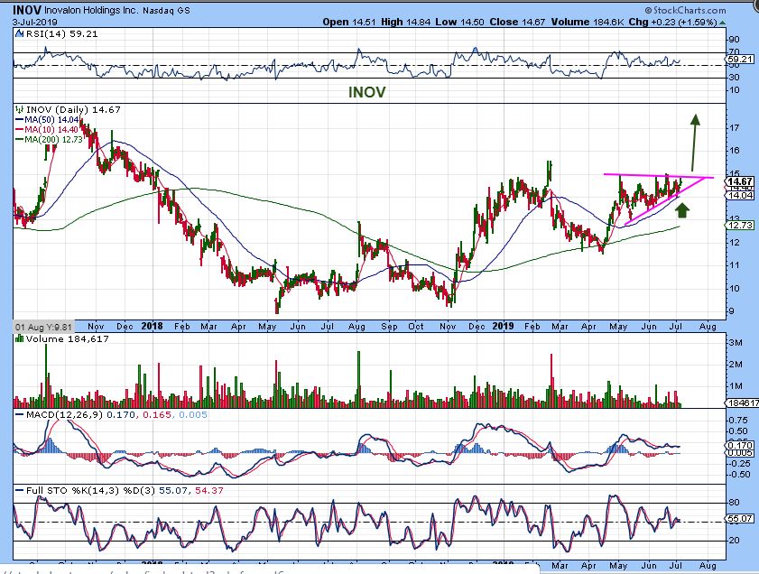 INOV – Another choppy candidate, but it looks like a flat topped wedge and a break higher is Bullish.