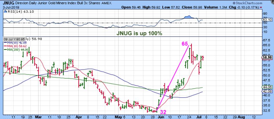 JNUG – yes, it is leveraged, but catching it near the Fed Minutes saw it run up 100% already