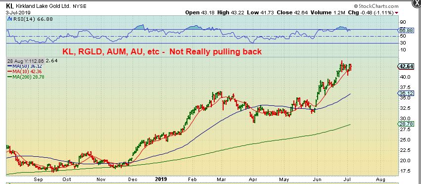 RGLD – This week I also posted this chart JULY 2nd to show how Gold dropped $24 Monday, but Many Miners hardly flinched. Read the chart. So again, we are holding a basket of Miners until things change.