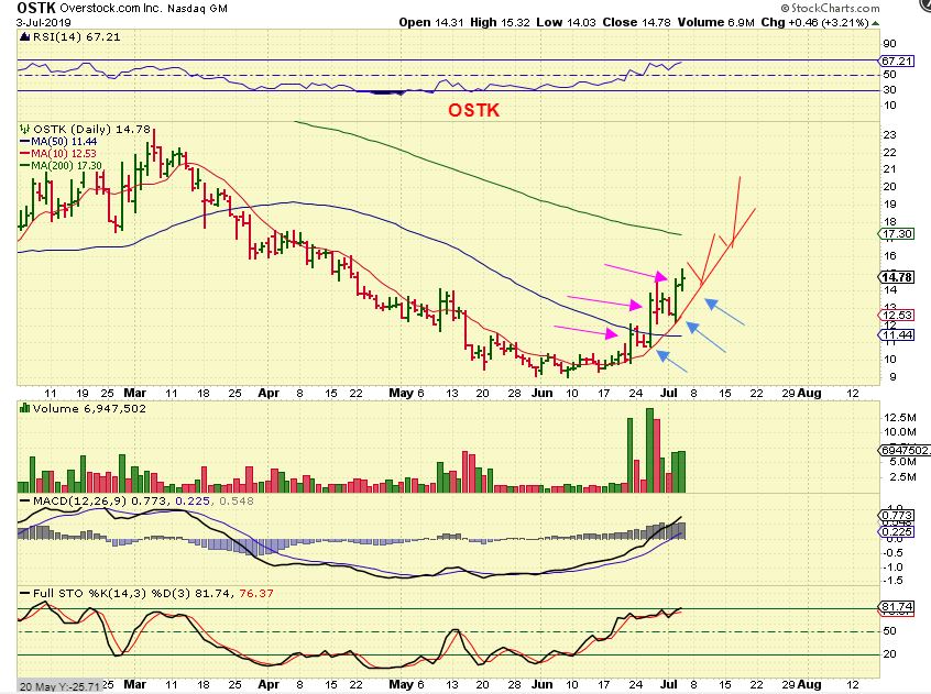 OSTK – OSTK is a tricky ride, but it is climbing the 10sma . It seems to Burst higher, then tag the 10sma, burst higher, then tag the 10sma, now it has burst higher. Buy at the 10sma?