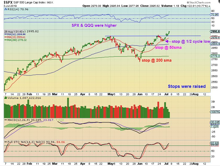 SPX – The SPX has been breaking to new highs. Stops were raised to where a 1/2 cycle low seems to have taken place, so if you were long, you’d still be in this trade. You may recall that the SPX & QQQ looked good, while the RUT & TRAN were questionable…