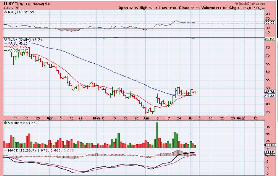 I mentioned TLRY earlier in June near $40. It is a BUY again here above the 50sma, now near $48. CGC & ACB looked a bit interesting too Wednesday. Take a look at the reversal on CGC if you are interested in this sector.