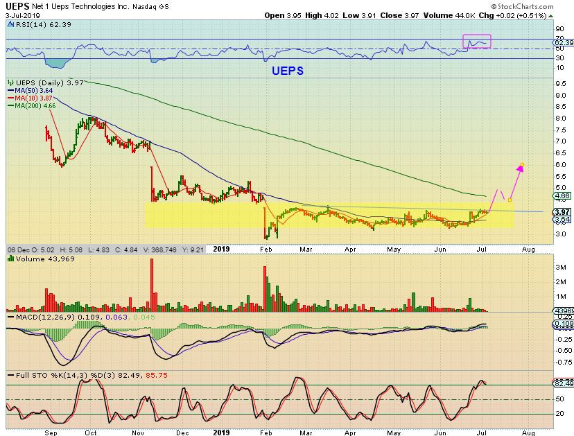 UEPS – This has a long base and good price potential as it recovers. It is a good set up and rsi gained strength, but risky when you look at how it dropped on the left hand side of the chart. It is above the 50sma & could run higher. Watch for earnings.