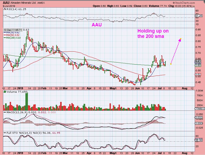 AAU   – 2+ week consolidation on the 200 sma.  You could buy this with a tight stop, or start a smaller position here, stop under the RED 50sma & add to that smaller position if it drops there & reverses.   I DO NOT think that this will drop unless Gold really sells down.