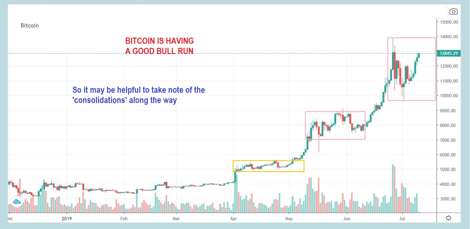 BITCOIN  – Not only does BITCOIN continue to run higher as expected,  but I wanted to point out HOW A BULL RUNS.  Look at BITCOIN here.  Those choppy consolidations are Very Big,  so when you think of what GOLD is doing right now? Look at these consolidations.  Gold is currently forming a flag or Box consolidation too. Each drop seems bearish, but then it ran higher.