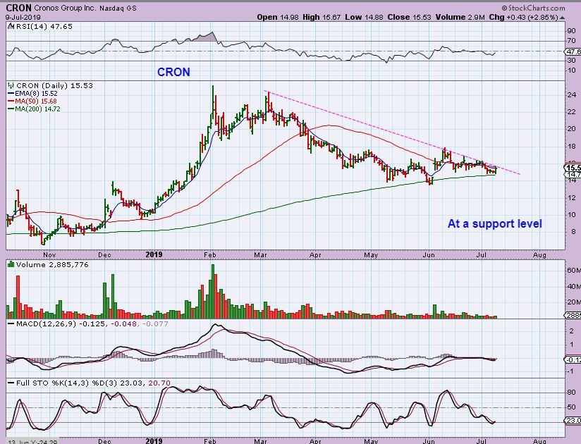CRON   – Some of the MJ STOCKS may be setting up, but it is taking time.  They are choppy.  CRON is riding the 200sma.  TLRY has been posted as a buy a few times as a buy, and a few of the smaller ones are Popping too.