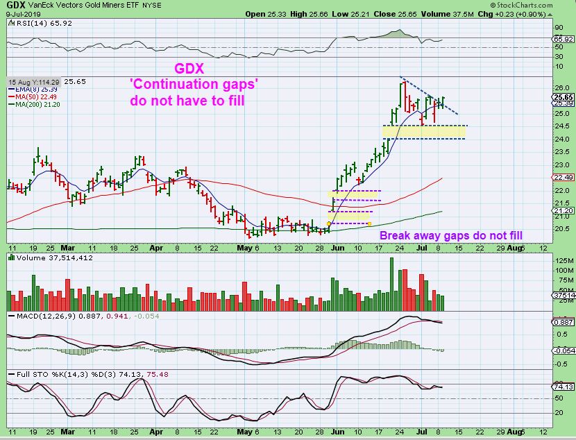 GDX  – True break away gaps do not usually fill, and ‘continuation gaps’ do not have to either.  This actually looks ready to move higher again.  Is that due to the FOMC MINUTES release coming up?  We’ll see.