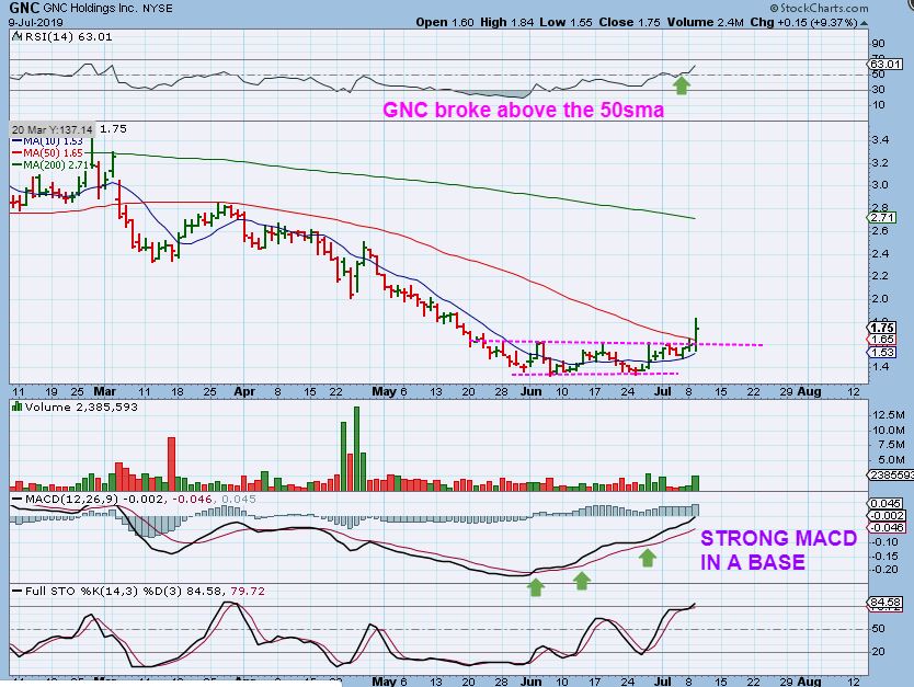 GNC – This is a nice break out from a base too, right through the 50sma. It is a buy here if it doesn’t gap up. If it drops to the magenta line, that’s even better.