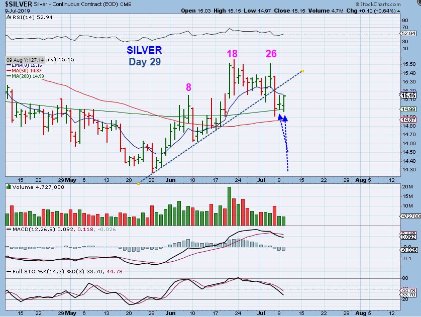SILVER  – Silver actually reversed off of the 200 sma support again.  Wednesday is day 30, this is due for a dcl any day.   How about on a Fed Minutes Wednesday or the day after?  🙂