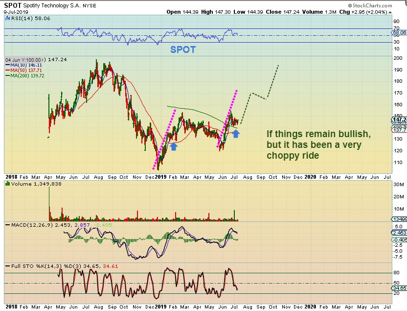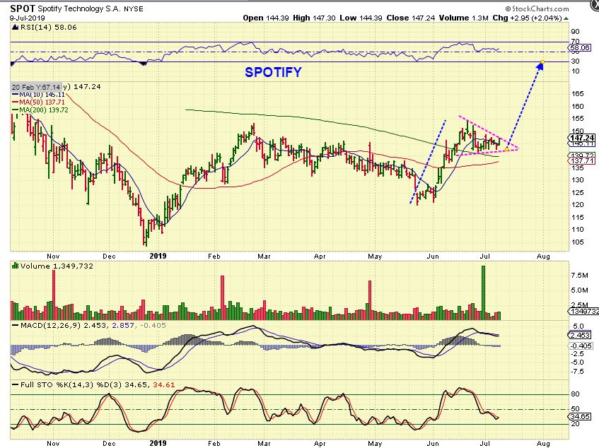SPOT   – This is a huge consolidation ( 4 or 5 months), but it may be ready to go since it is at the apex of a bull flag. On this one I’d wait for the break out, because…