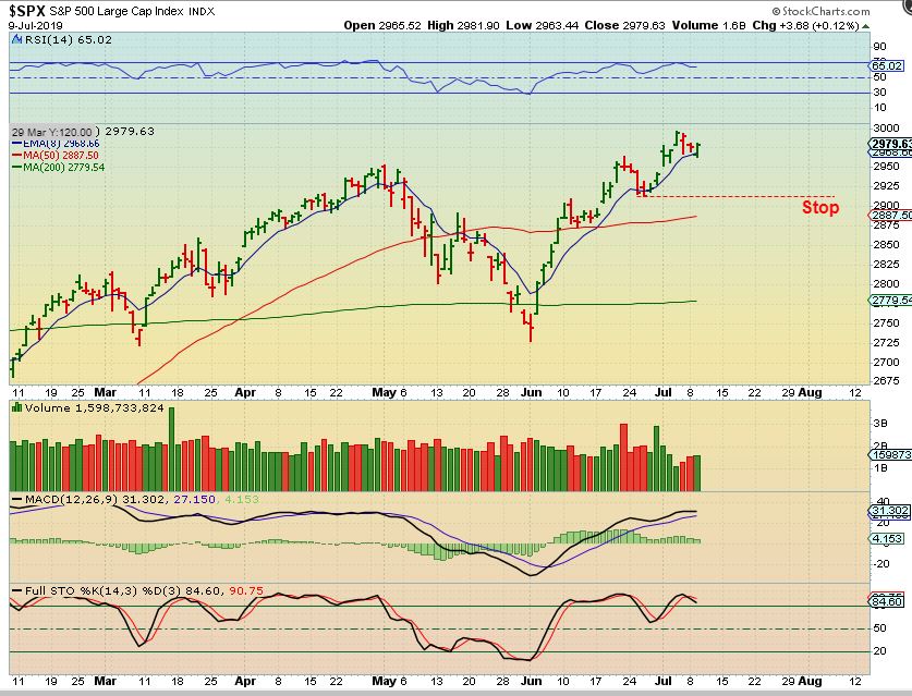 SPX  – The SPX reversed right on the 8 ema.  A stop has been raised from under the 50sma to under the 1/2 cycle low, because that low should now hold as the next higher low.