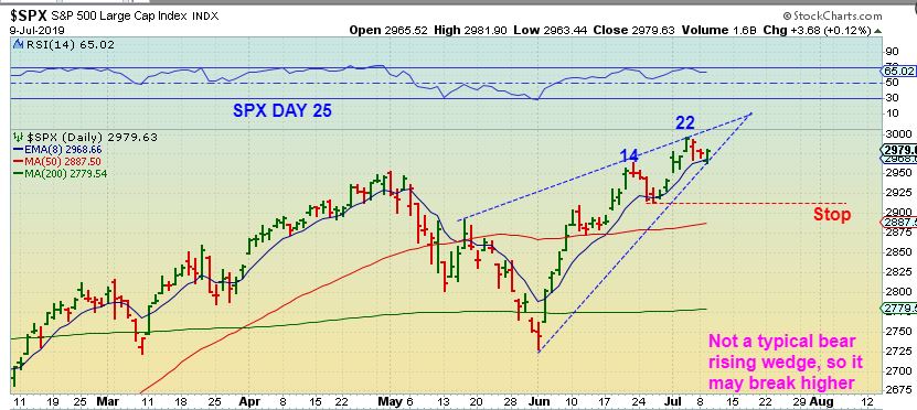 SPX –  I do see a bearish rising wedge, but the lower trend line is not what I would call technically accurate,  so I am ignoring that for now.  The Fed will be on display today, we’ll see if this break up , down, or chops further. Day 25 indicates that a dip could start at any time.