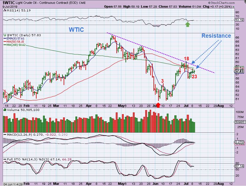 WTIC  – Oil is still pushing at resistance, day 23 can be about  midpoint for a 40+ daily cycle.  Oil inventory is released on Wednesday mornings Eastern Time. Oil can rise to $59 and still be at the trend line