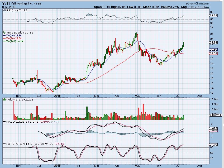 YETI  –  I looked at this chart and it has run from $13 to $36 this year, then dropped and now is running for the highs again ( Cup).   It was a buy at the 50sma, but still could be bought.   Now that we have that story out of the way…
