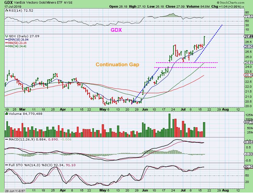 GDX– GDX broke out and finally had the kind of volume that I feel is a sign of strength. As I expected , The continuation gap never filled and can be a 1/2 way point in the run higher, I’ve called for an initial $28 area target, but it can extend to former highs of 2016.