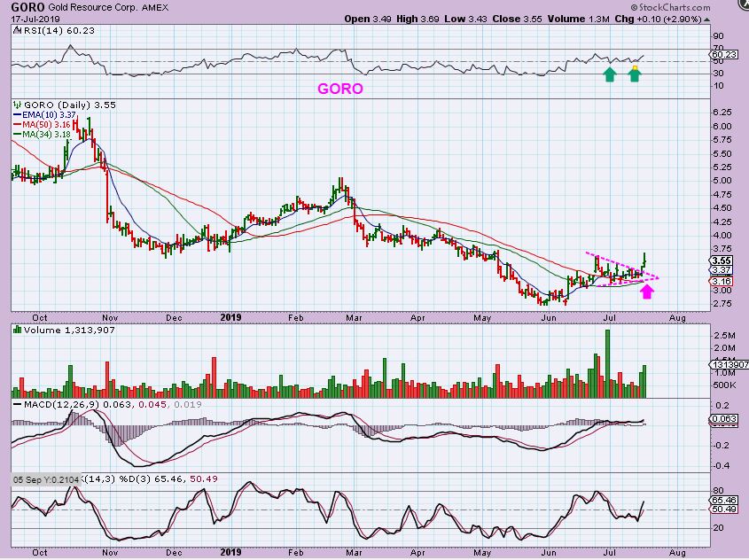 GORO – Finally a burst of volume and a break from the triangle. This is lagging and still in the base. I do not know if something is fundamentally wrong with it, so you may want to check their news feed & their last earnings report.