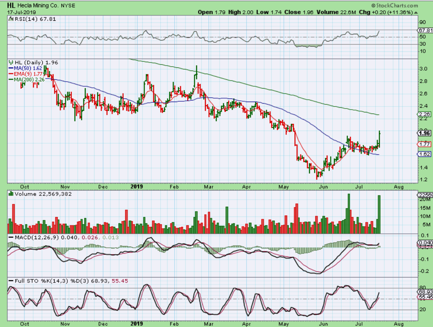 HL – It shot up 11% , and may run to the 200sma. Some Miners are slicing right through their 200 sma, so this might too.