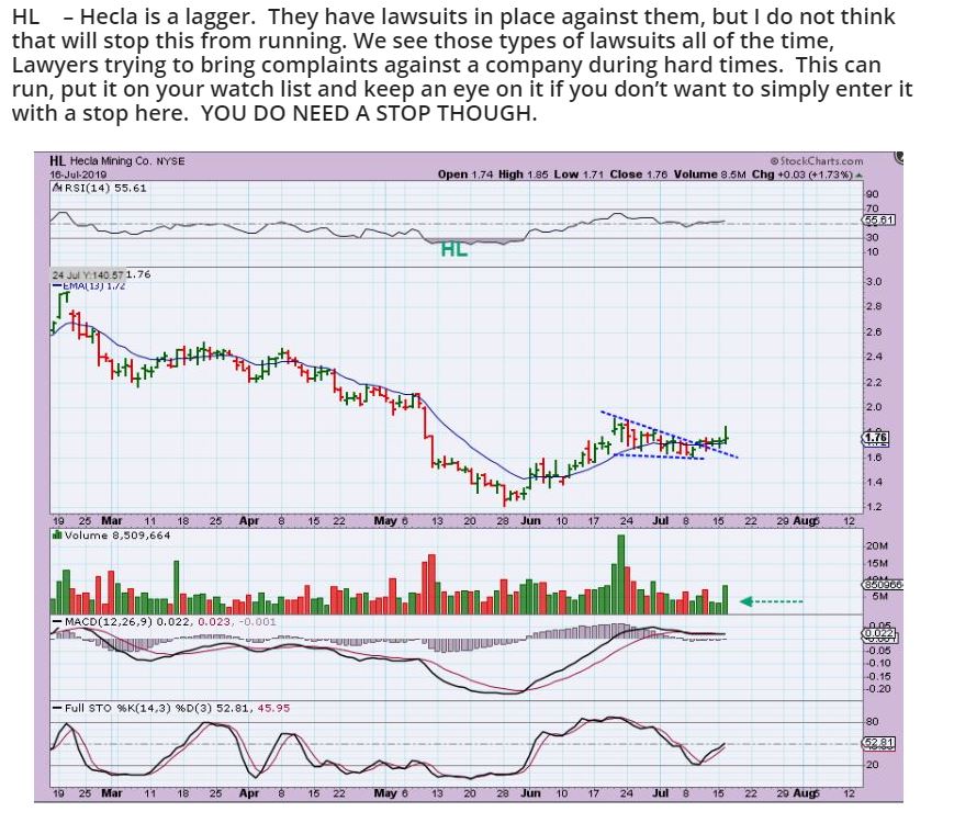 HL – I also pointed out yesterday in the report that HL was a lagger, but Volume Popped and the MACD is strong. You can read what I wrote (Cautionary)….