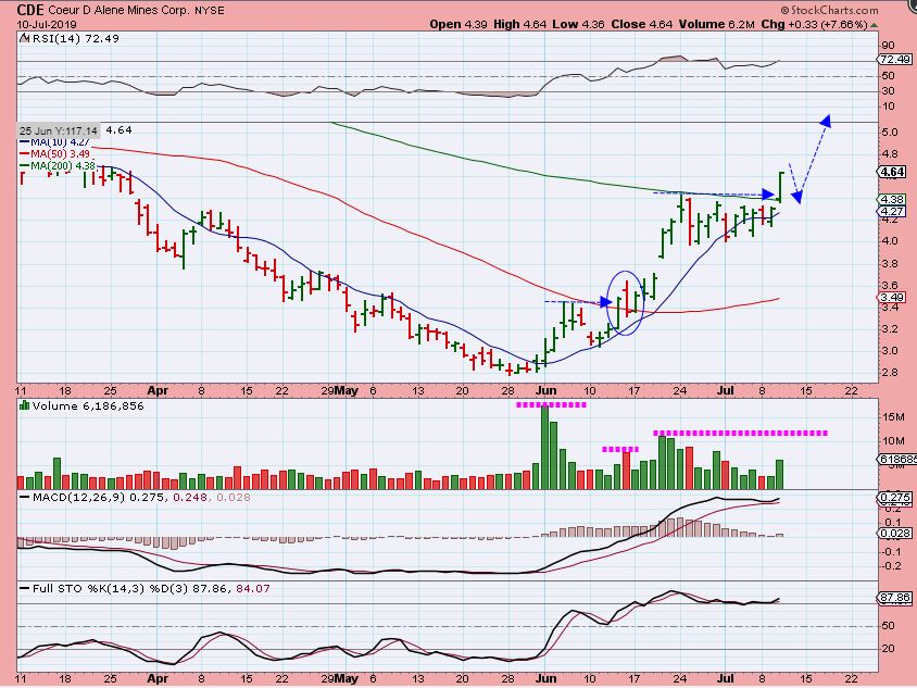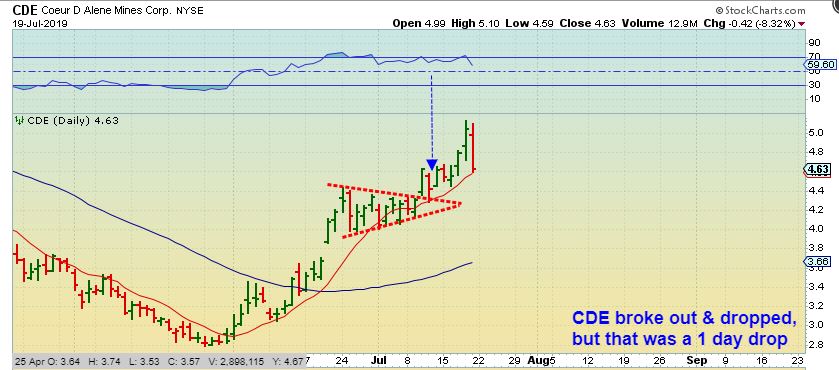 CDE BROKE OUT – When CDE broke out, I mentioned that it could drop first and then run on this July 10 chart…