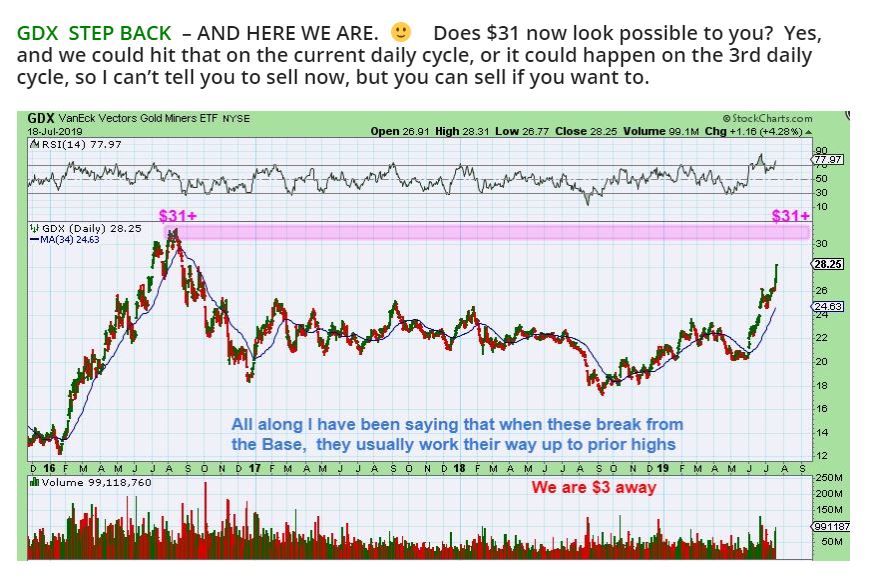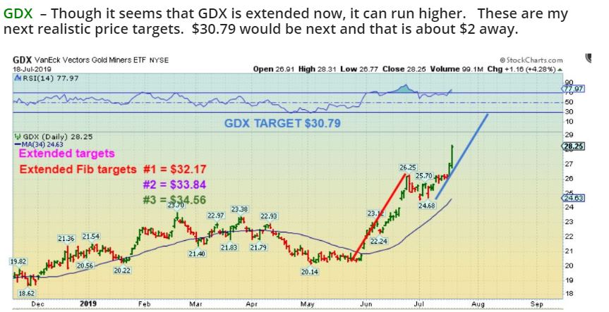 GDX TARGETS FROM FRIDAYS REPORT – I pointed out my FIB TARGETS upside, which can be reached after we get a dip. Notice that $30.79 is my next TARGET. And then even $32 – $34.56 are actual Fib targets.