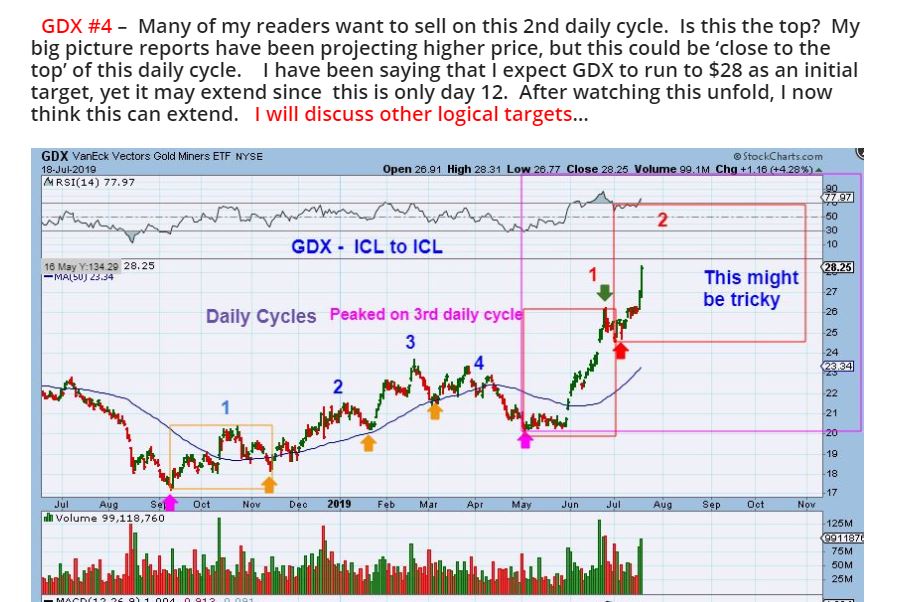 Below is my GDX from Fridays report – I did have a $28 price target as my initial cal, and GDX was at 28. Even though we dipped Friday, I’m thinking that we might get the same 1/2 cycle low here & more upside, so…