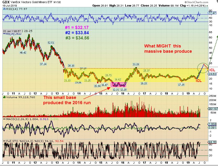 GDX – So let’s go to the really big picture and I’ll point out something else now. I have been taking this 1 step at a time. We are now very close to reaching that step of 2016 highs (with these additional targets possible). That now leads up to the next step, a MUCH HIGHER TARGET over time. 2012 highs and 2011 highs eventually.