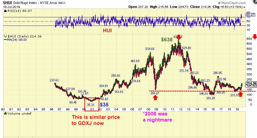 1. REASON #1– In the start of the Bull run of 2000, HUI was $35. That is the same as GDXJ now. By the end of the run, HUI went from $35 to $638. WOW! Can you imagine if GDXJ runs from $35 to even only $300 in a few years? I think we’ll all be very well rewarded for riding the Bull in Miners. The other reason for this chart…