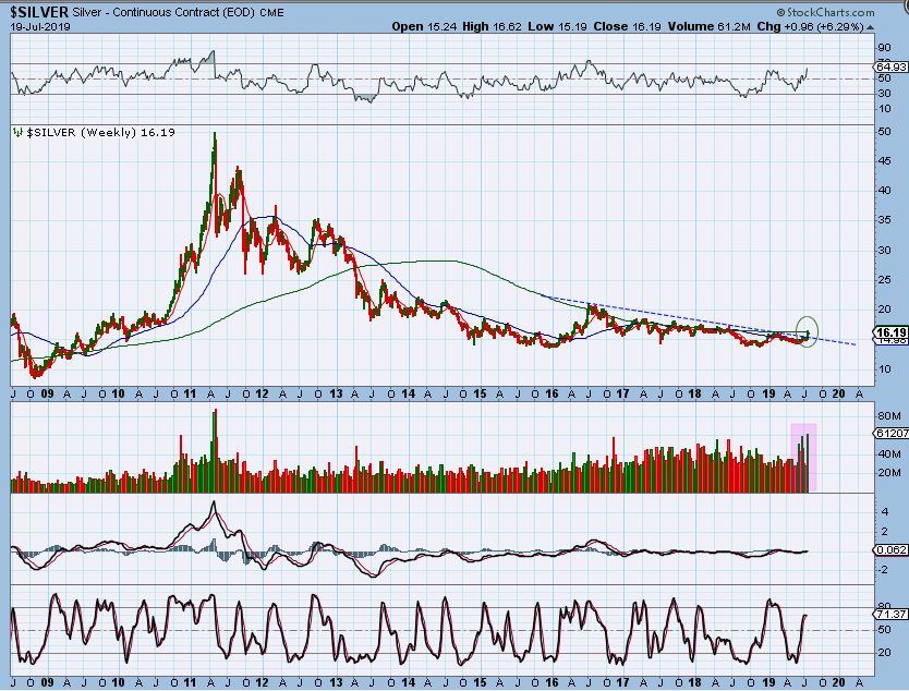 SILVER WEEKLY BIGGER PICTURE – Focusing on the Big Picture in the weekend reports, we see that the upside potential over time for Silver is great. Notice volume spiking as it tries to break free.