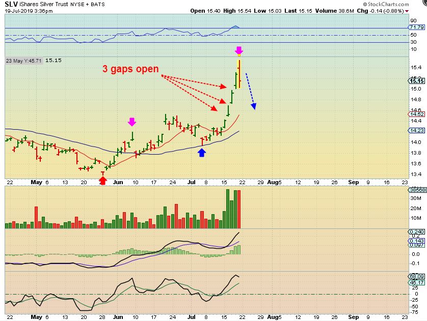 SLV – There is no way to know for sure, but we have 3 gaps open in a row. It would make sense that 2 of them could fill as price tags the 10sma area. Hi volume reversals off of the top can lead to additional selling.
