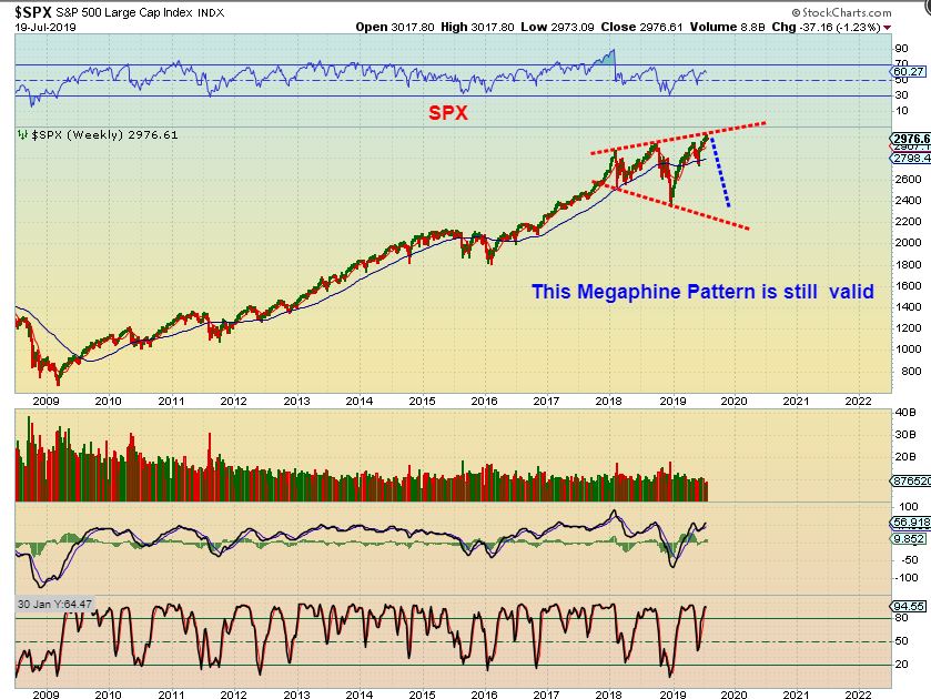 SPX – I have mentioned that the SPX Daily is due for a drop into dcl (Daily Cycle Low). Here in the big Picture we see a reversal at the resistance. That drop may have begun.