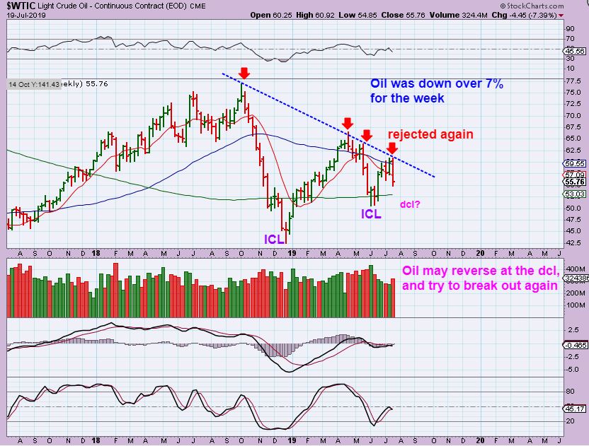 WTIC – Oil dropped sharply this week. It may bounce at the 200 week MA green line as a dcl, or it may break down. Oil is choppy and difficult to trade unless you only trade it short term.