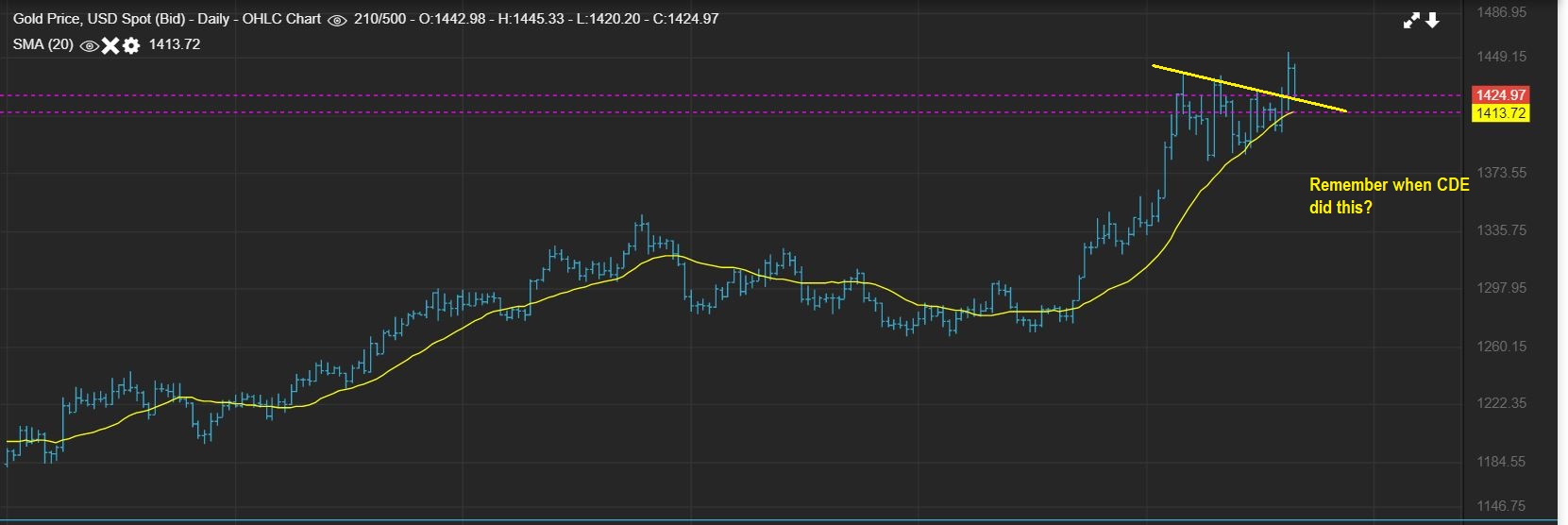 CDE – It did just that. CDE broke out & dropped back, just like Gold has now done. CDE (or Gold so far) didn’t crash below the APEX. IMPORTANT: That Doesn’t mean that Gold will definitely now run higher, but this shows you that it might do as CDE did, and that was still a bit Choppy. We’ll now very soon, since Gold opens 6 p.m. Sunday night Eastern Time.