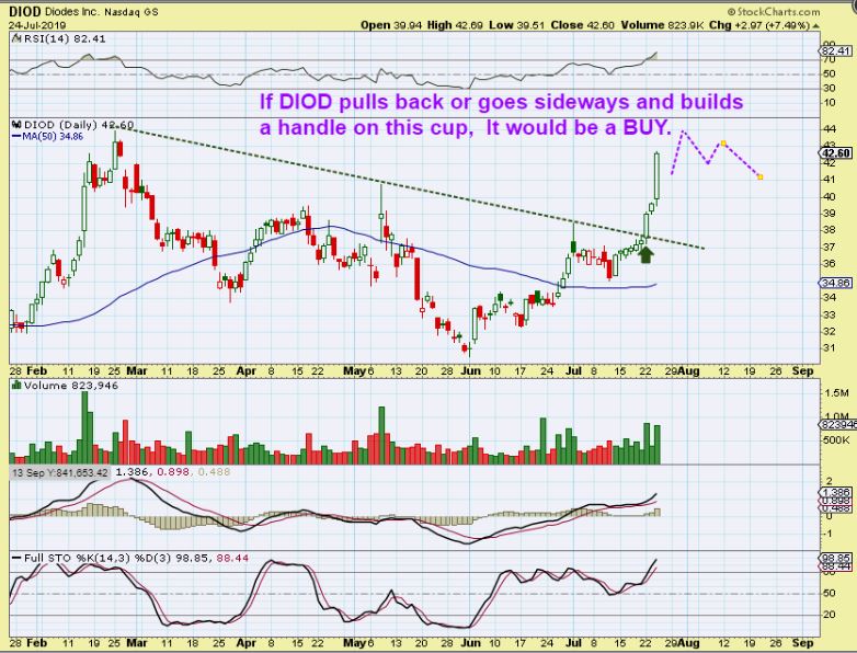 DIOD DAILY – In June DIOD bottomed at $31 and has moved to $42 ( with a 7% pop Wednesday). It now seems to have formed a cup too & could build a handle. It also may run a bit higher before it tops, because…