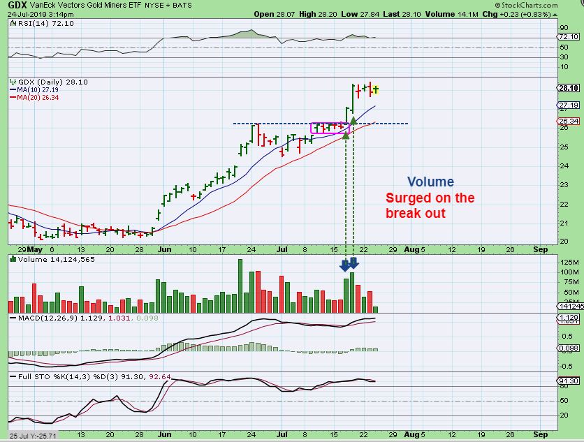 GDX #3 – Notice that Volume suddenly popped on the break out days. That is what I look for and have discussed a lot in the past.