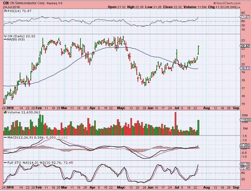 ON – So many of the semis are popping. This is not a buy, it is getting late if it is only going to run to former highs, but I wanted to show that many in the sector are acting correctly.