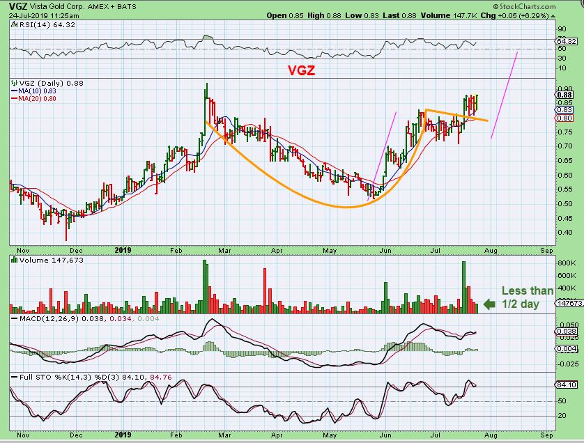 VGZ – This is another one that some of us bought down in the 56-58 cent area. I posted this in the morning, since it also looks bullishly set up as a cup & handle now and may be ready to break out & run. When I bought this in May under 60 cents…
