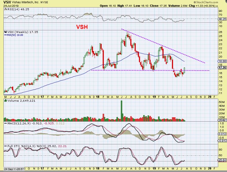 VSH WEEKLY – Stepping back you can see a recovery possibly taking place. If Semis continue to be bullish, VSH can run at least to the purple line, maybe higher. It can also run to the 2018 highs over time.
