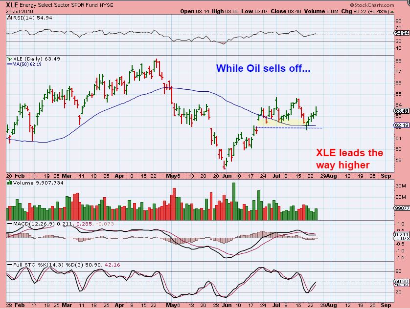 XLE – The XLE, OIH, and XOP are acting moving slowly higher while Oil drops. This may signal that Oil is going to bottom soon too.