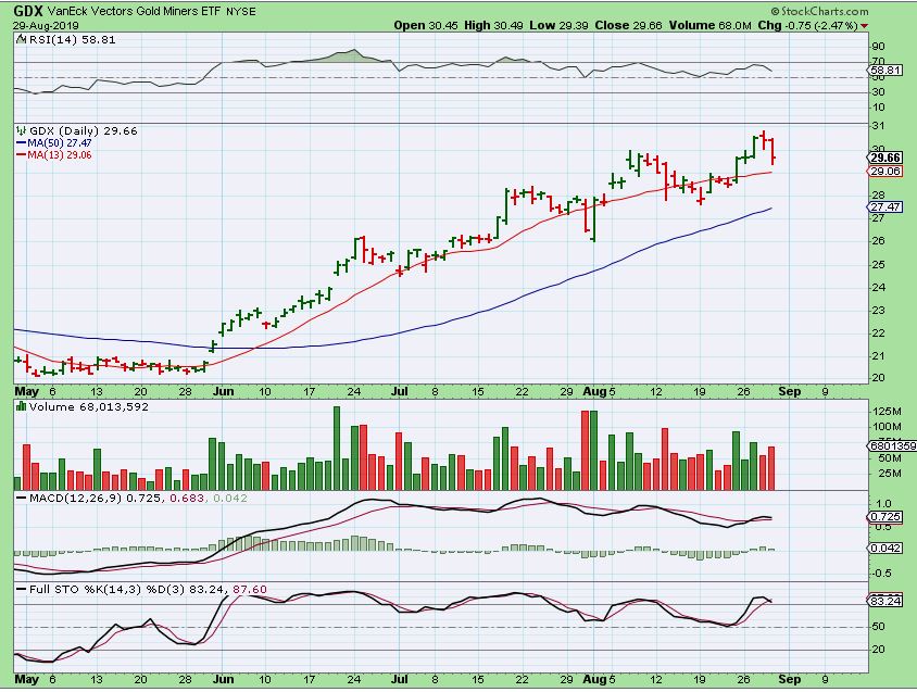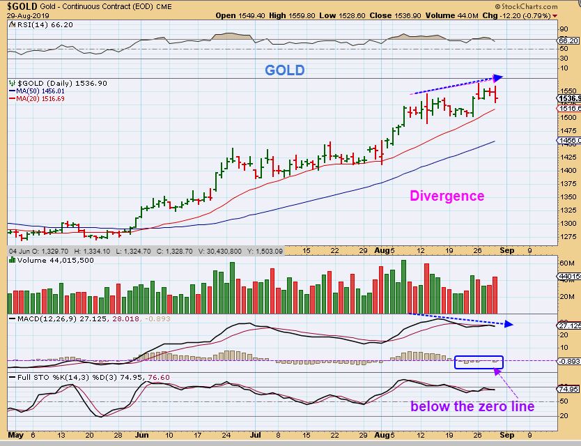 GOLD – Gold & SILVER Were higher in the morning trade, but Miners were selling off. By the close, GOLD & Silver sold off too. Yesterdays report mentioned that we have a long weekend ahead, and in my last weekend report I said that this week could be bullish, but things looked ready to top soon. Sunday night we then hit my $1550 target in Gold- so today is FRIDAY, and your choice is either Hold through a 3 day weekend when Gold trades Sunday through Tuesday? Or lighten up? I lightened up.
