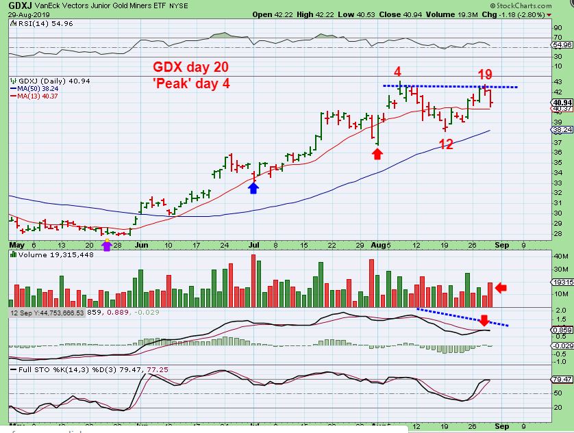 GDXJ –That MACD is quite weak, and we are at prior highs with the MACD HISTOGRAM dipping below zero. I think we are ready for a pull back.