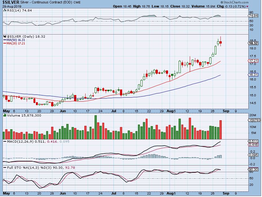 SLV – This is heavy volume and also a bearish engulfing. Silver may have topped at $18.60