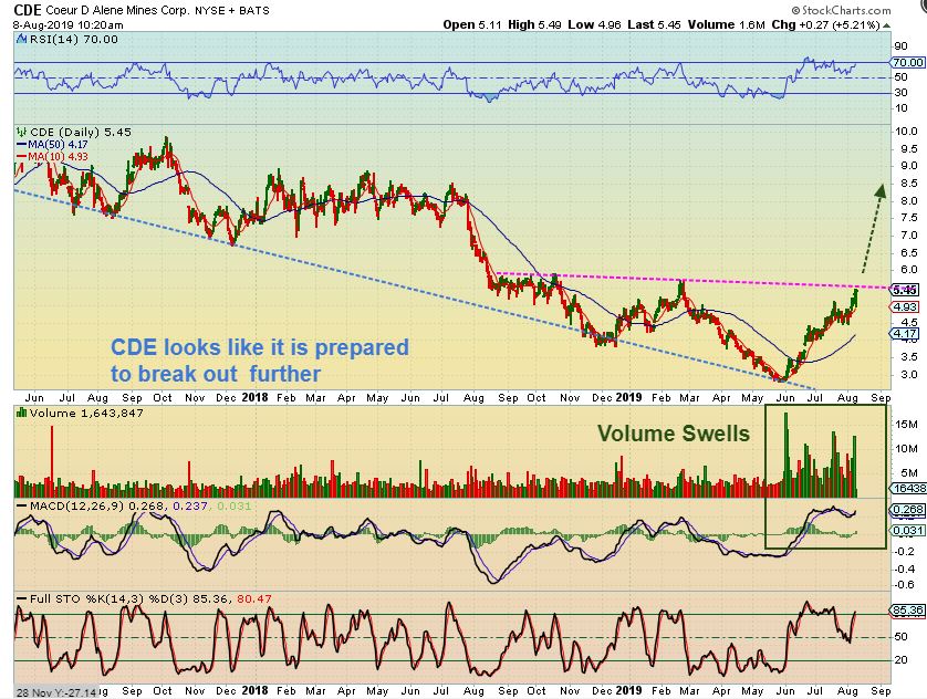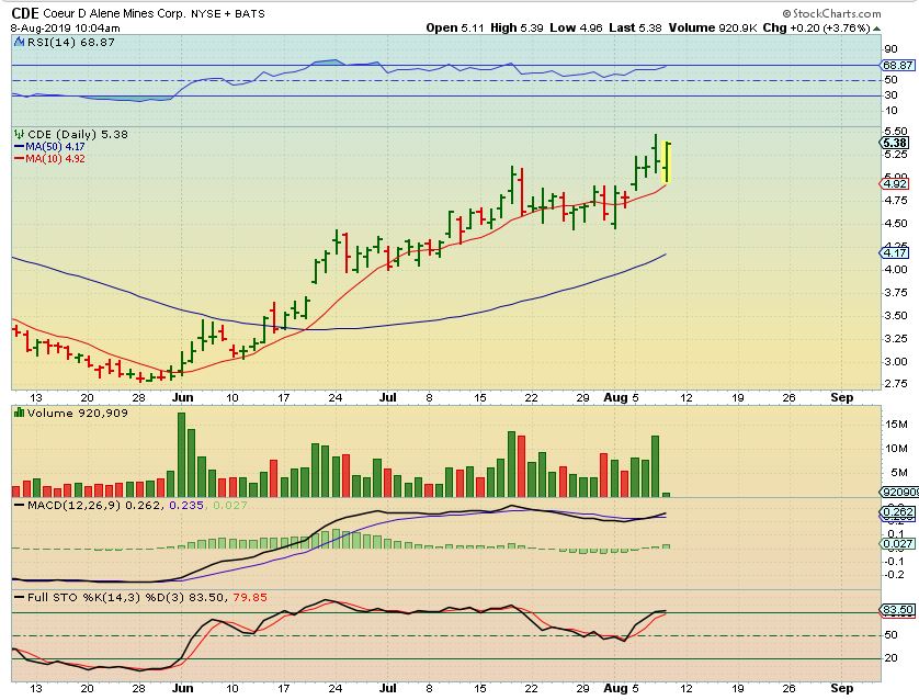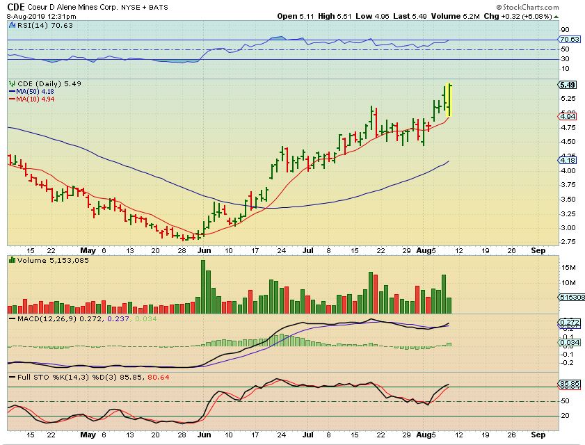 CDE – Midday it was now at new recent highs, and it actually closed at $5.59, another 10 cents higher…