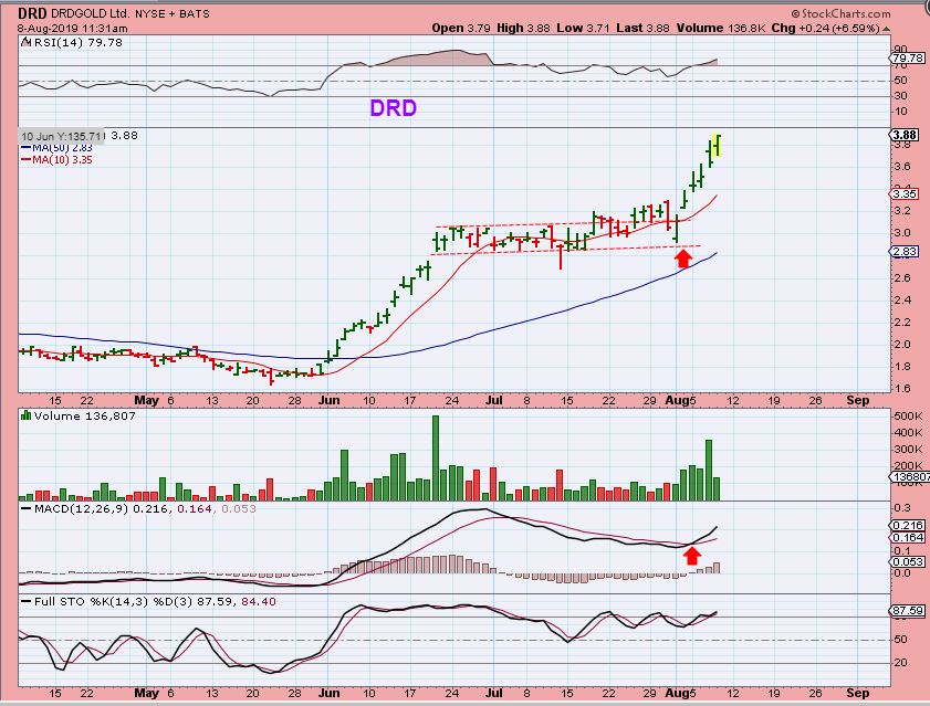 DRD – Up over 100%. I wanted to also show everyone that all Miners will not follow cycles or GDX / GDXJ. They can make their own path. This had a Big Run, went sideways, then started this 2nd leg higher. This chart does not resemble GDX or GDXJ, so even if I expect a pull back in GDX, holding a small basket of Miners is prudent.