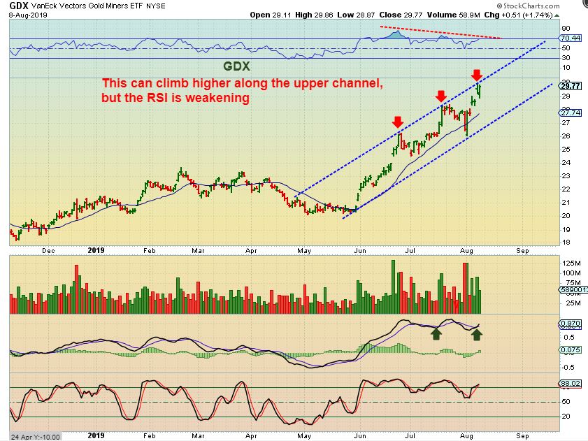 GDX – GDX is at the top of a channel, but price can climb along an upper channel line. The RSI is weakening, so I would expect a dip down soon. So…