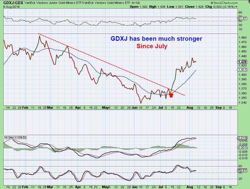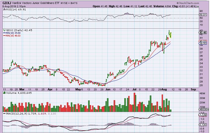 GDXJ VS GDX – GDXJ has been leading for weeks and is stronger.