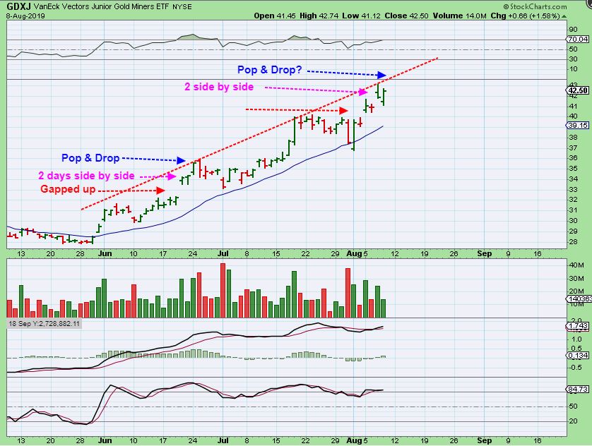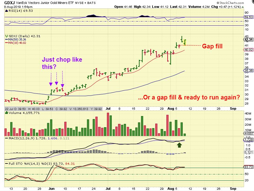 GDXJ- Will Thursdays action just chop like we saw in June? Maybe, but that reversal could also lead to another run higher, since the bull keeps surprising to the upside. I do think we get a little more upside, and that is why I mentioned again in yesterdays report, ‘You don’t want to sell everything and lose position if the surprises are upside in a Bull run’.
