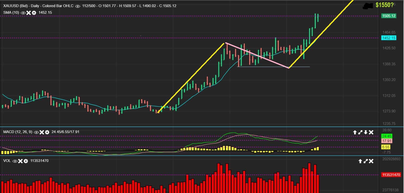 GOLD – Gold still looks like it wants to run to $1550 to finish this measured move. It could Bull Flag here if it doesn’t just continue higher now.
