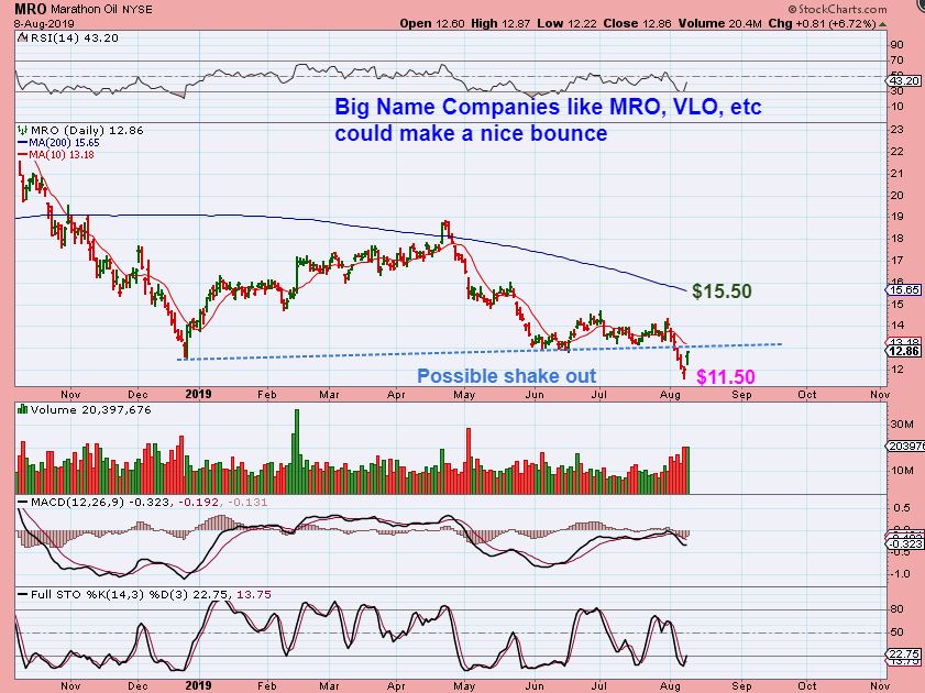 MRO – No Big change with OIL, but Oil / Energy stocks like MRO, VLO, WTI, DNR, and others look like they are setting up for at least a good bounce. If MRO gets to the 200sma, that is a big move.