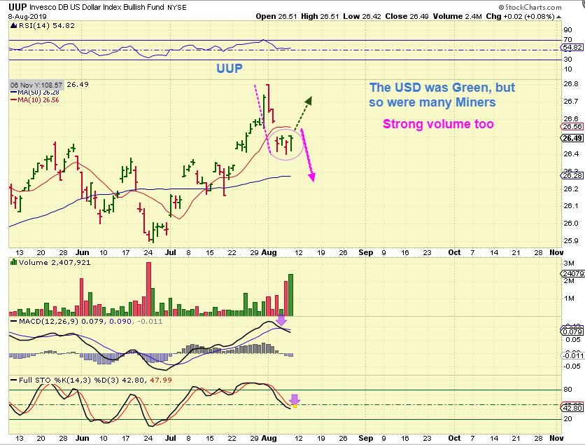 UUP – The USD was green with strong volume in the UUP (Miners were green too). The sideways action may be allowing Precious Metals to finish their move. I’ll explain that next…