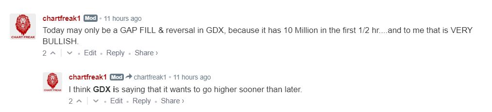 GDX – Only 1/2 hr into trading GDX had 10 Million in Volume. I noticed that GDX dropped down, tried to fill a gap, and then went green WITH GOLD & SILVER BOTH DOWN, and THE USD UP. That is all Bullish action, so I posted this on that reversal at 10 a.m.